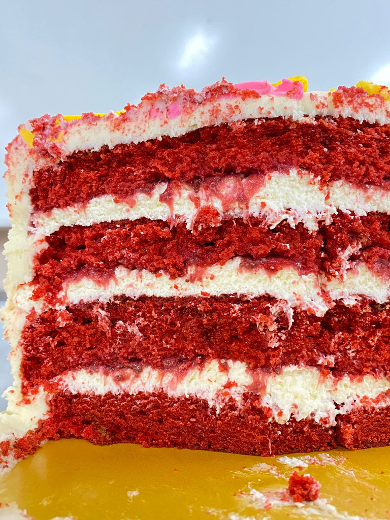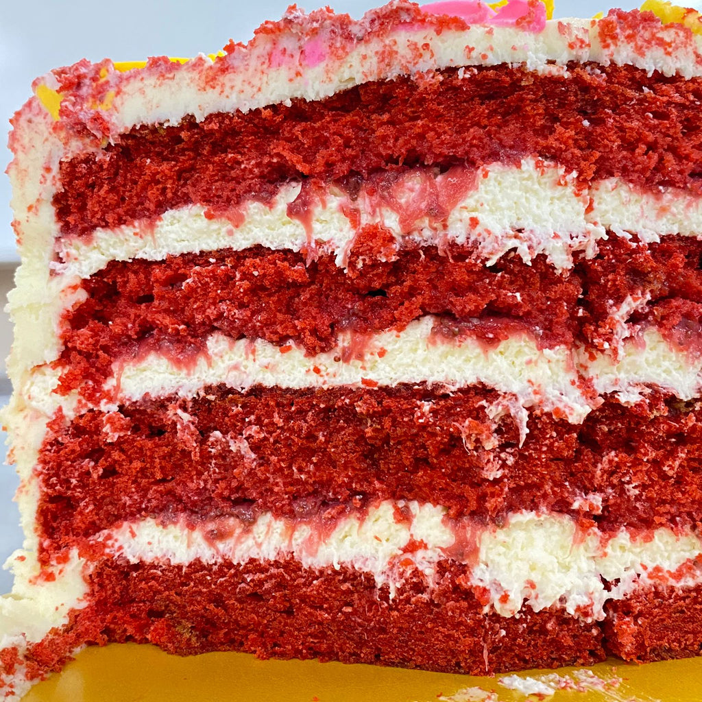 Bolo Red Velvet recheado com compota de frutas vermelhas e mousse de Creme de queijo e chocolate branco